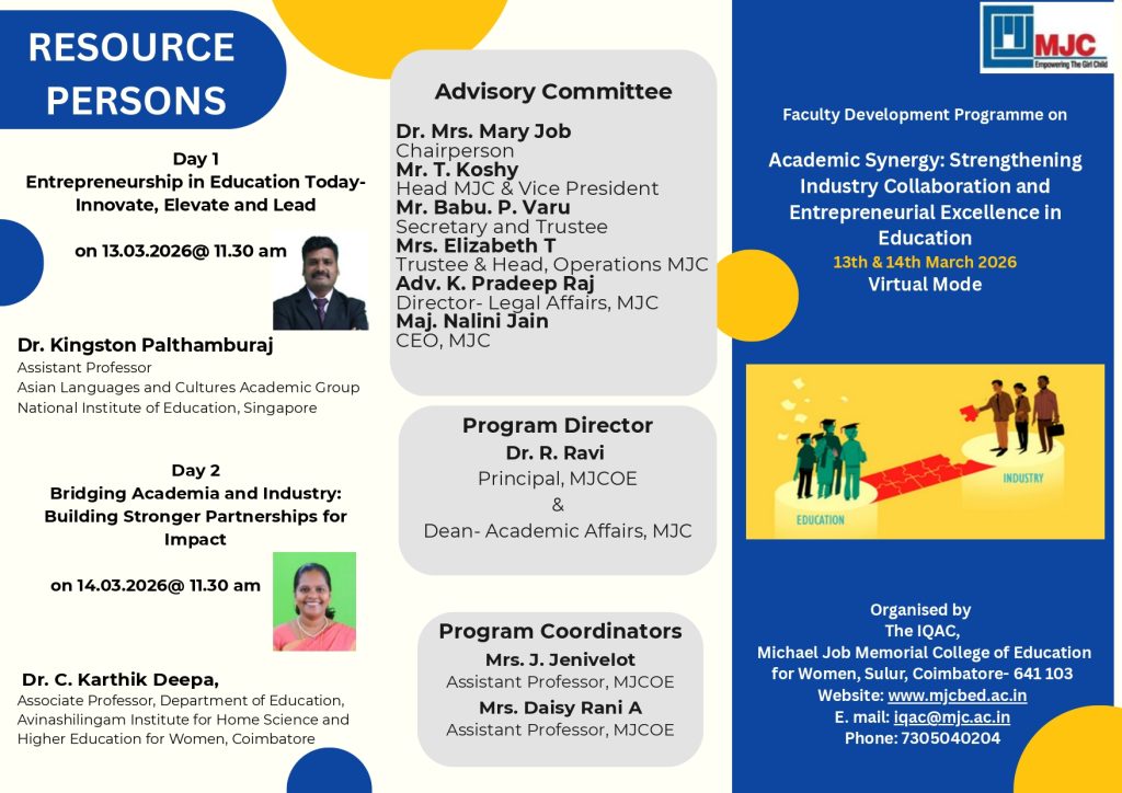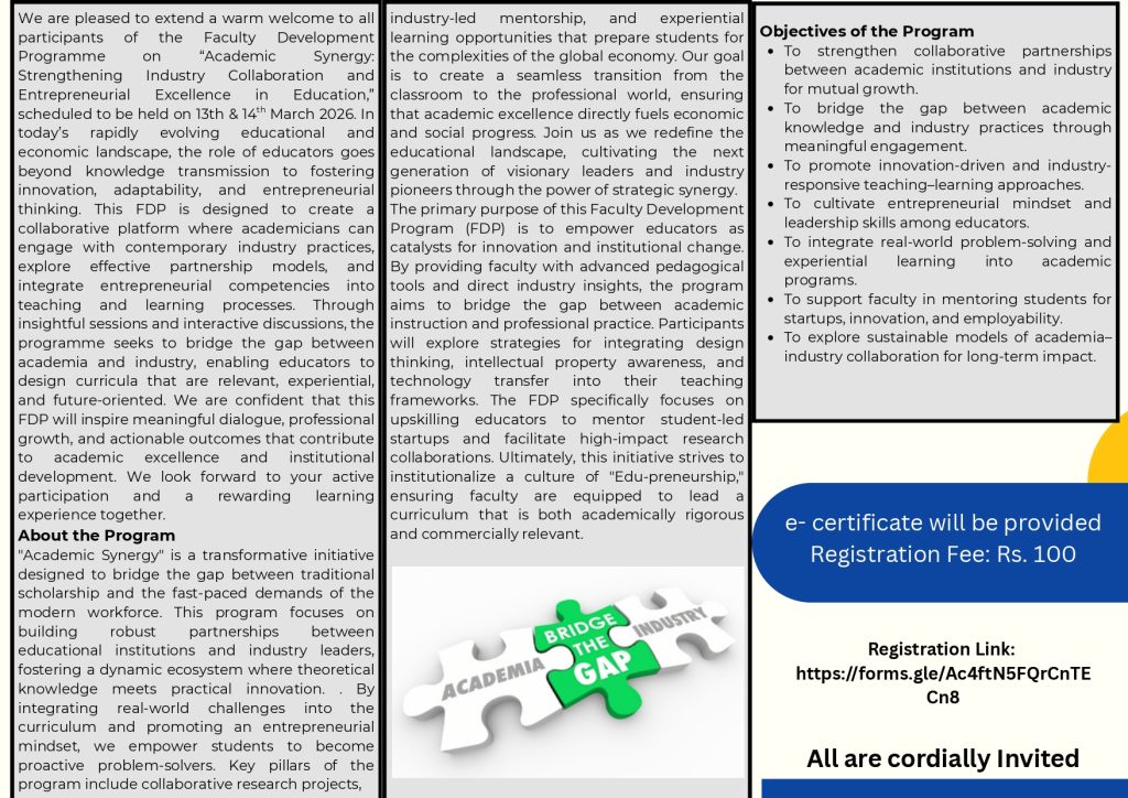 Faculty Development Programme – 13th & 14th March 2026By masanupriya / February 20, 2026 Academic Synergy : Strengthening Industry Collaboration and Entrepreneurial Excellence in Education Online Registration Link : https://forms.gle/Ac4ftN5FQrCnTECn8
